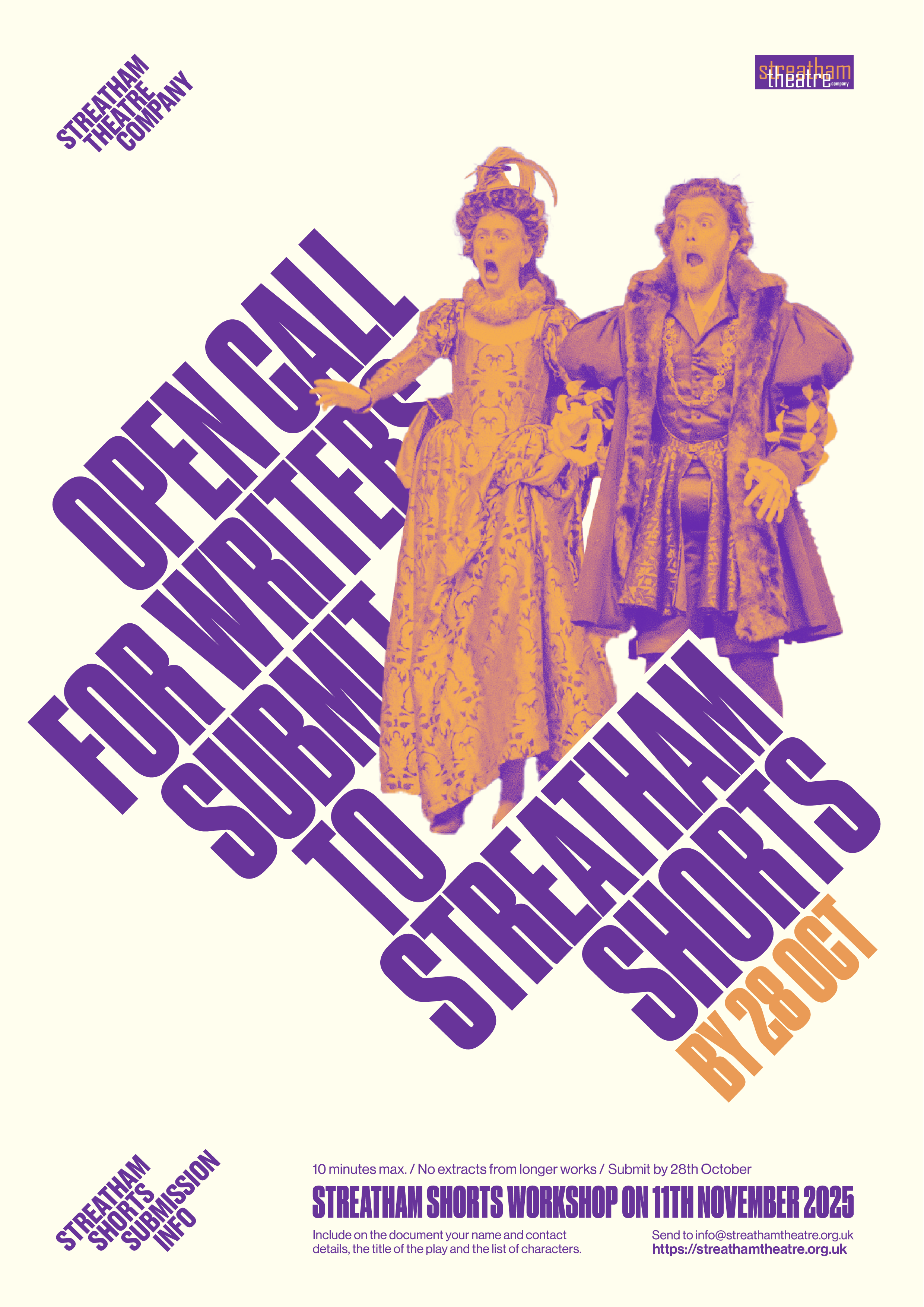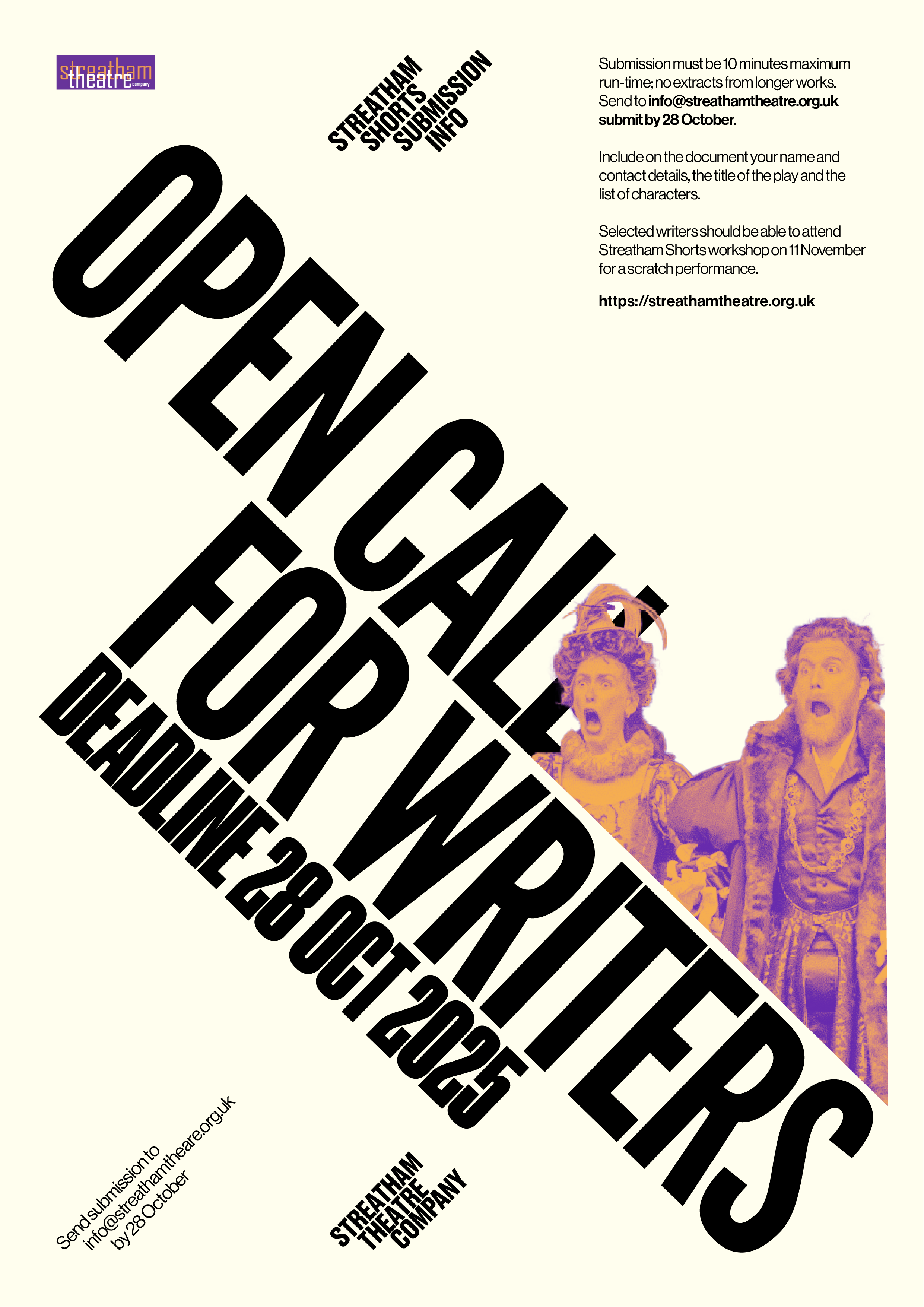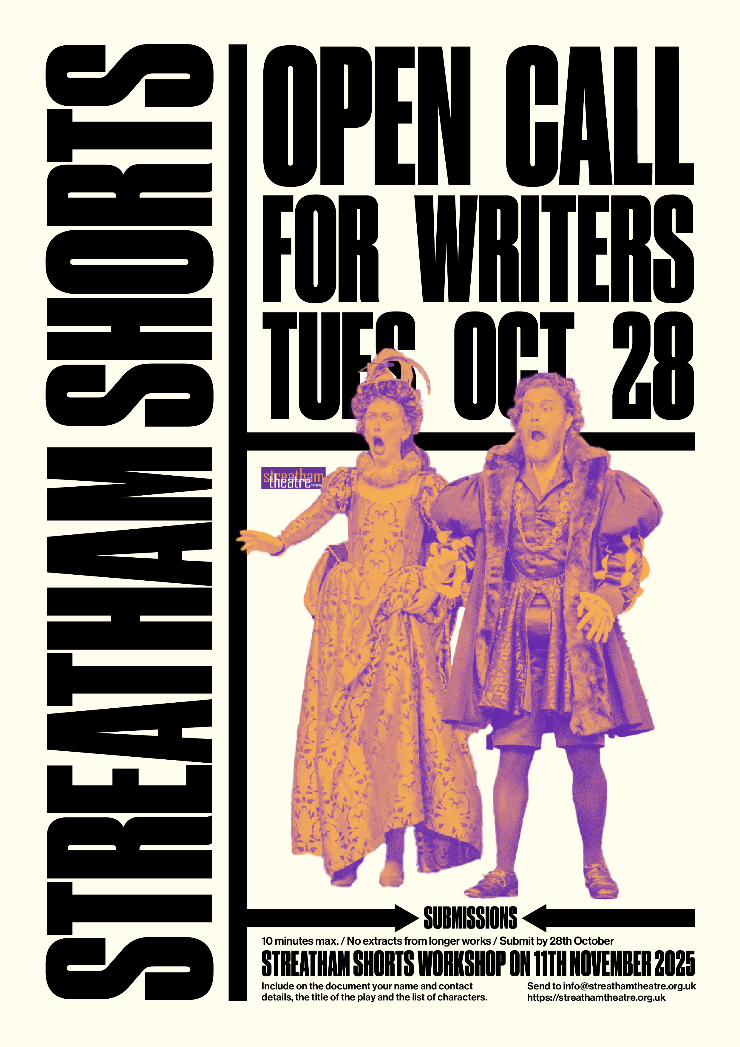 Submissions (10 minutes maximum run-time; must standalone; no extracts from longer works; unpublished and unperformed) should be sent to info@streathamtheatre.org.uk titled “Streatham Shorts”.